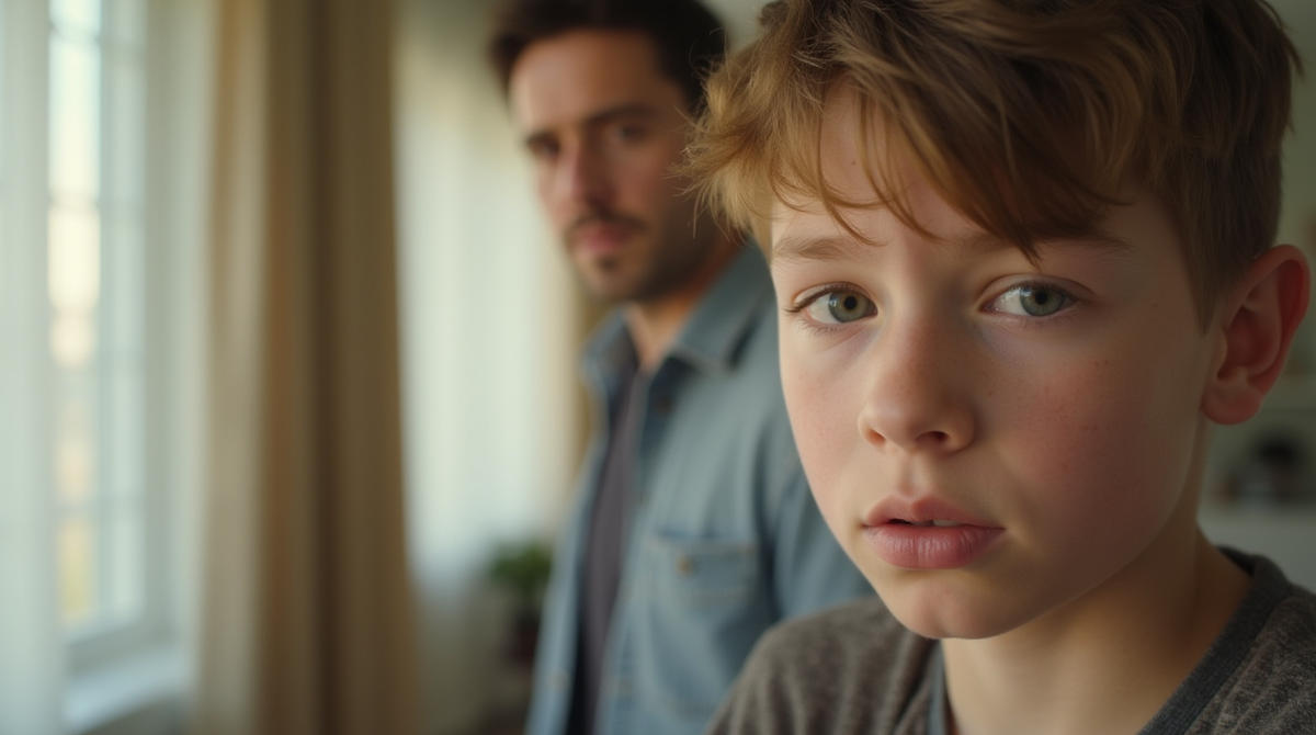 Денис вошёл, стряхнул снег с куртки, поднял глаза — и замер. Взгляд его метнулся от отца к женщине на диване. Лицо сразу стало жёстким.