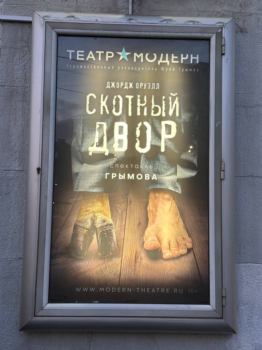 Итак, подробный рассказ о спектакле «Скотный двор» в театре «Модерн». Осторожно, спойлеры! Начну с самого театра. Очень уютный, милый особнячок. Приятно отношение к зрителю. Заходишь - и ощущение, что тебя ждали, ты дорогой гость. Вокруг капельдинеры в прекрасных костюмах, прочие сотрудники в обручах с рожками ))) То есть все продумано до мелочей. Пока ждешь спектакля, можно посидеть как будто в разных гостиных. Это интересно! Но людям, которые пришли уже под начало спектакля, мест не хватило нигде, и они стояли просто в фойе. Буфет тоже показался дороже БТ. Но все равно театру от меня пятерка! Теперь о самом спектакле. Моей проблемой было то, что книгу я прочитала совсем недавно, и она привела меня в дикий восторг. Мне казалось, что Оруэлл придумал всё так гениально, сумел так наглядно показать, как в обществе, задуманном как братская демократия с общим имуществом и равными правами, постепенно одни становятся равнее других. Как эти заповеди, написанные на стене сарая, постепенно