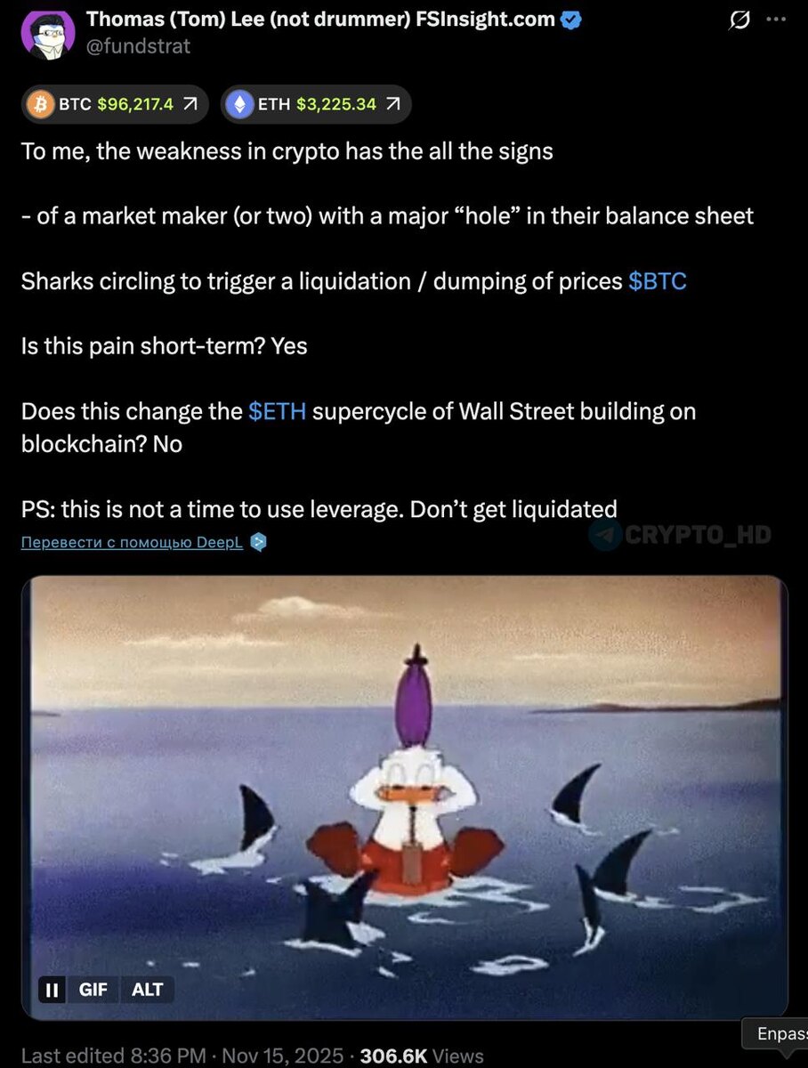 ❗️Том Ли: У одного (двух) маркетмейкеров на крипторынке имеется серьезная «дыра» в балансе. - «Акулы кружат, чтобы спровоцировать ликвидацию и дамп цен» - «Эта боль краткосрочная? Да. Изменит ли это суперцикл #ETH? Нет. - «Сейчас не время использовать кредитное плечо» Том Ли - управляющий партнёр и глава исследований в Fundstrat Global Advisors. Член совета директоров компании Bitmine. Ранее: - «суперцикл» - по уши в ETH Crypto Headlines