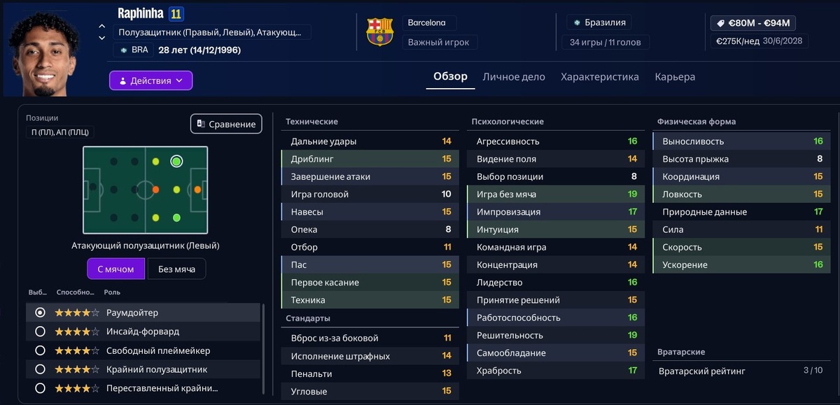 Самые шокирующие характеристики в новом менеджере получил Рафинья. Бразилец завершил прошлый сезон с рекордом ЛЧ и претендовал на «Золотой мяч», но не заслужил ни одного технического показателя выше 15 из 20 баллов! По версии Sports Interactive секрет бразильца в невероятной менталке, а с мячом он практически на вы. В общем рейтинге вингеров бразилец мог бы оказаться рядом с Усманом Дембеле и Мо Салахом, но заметно уступил даже Винисиусу и Букайо Сака.
