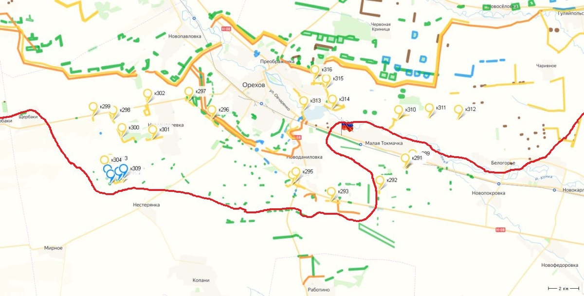 В ответ на пост Орехов. Взятие Малой Токмачки Кусочек поселка, переведен в серую зону. Он находится в опасной близости к укреплениям уже непосредственно самого Орехова. (у коллеги взял схему обороны). Как видите, между прудом и Новоданиловкой все перекрыто и перерыто. А с севера за рекой Конкой огромный полевой УР в который наши даже не суются. Штурма в лоб ожидать не стоит. А вот Новоданиловке можно напрячься, по ней будут долбить. После взятия, образуется опорная пара из двух населенных пунктов, блокирующих по границе с юга и с юго-востока Орехов. Это будет уже очень опасно для противника. схемы и карты