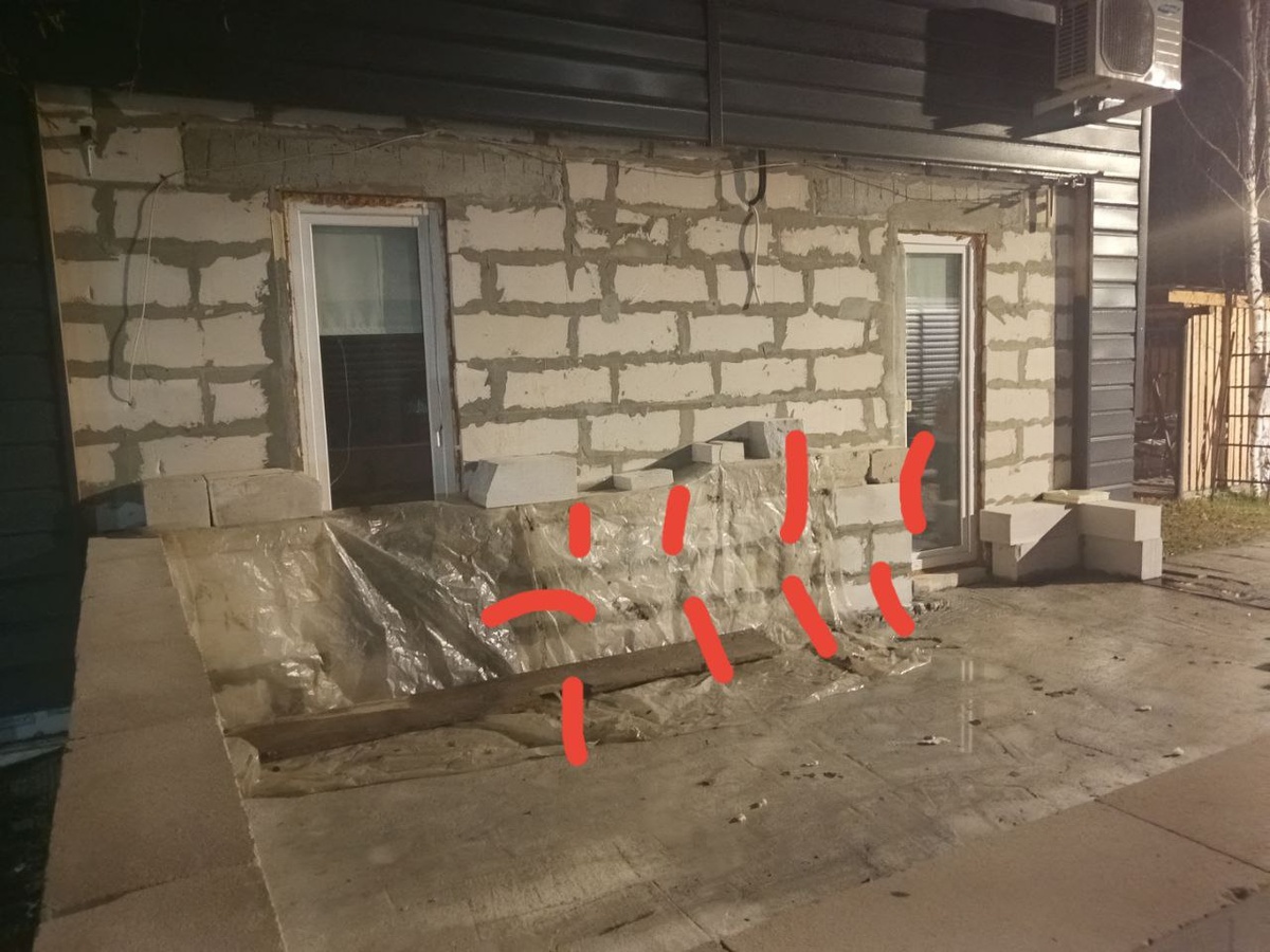 +9 блоков между стеклянных дверей выложил и укрыл пленкой от дождя