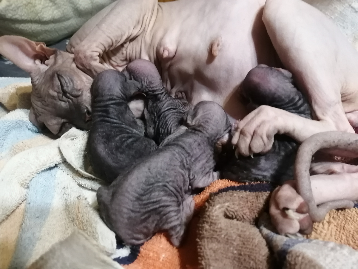 Один малыш уже один глазик открыл. Глазик открыл, это не значит, что он видит. Просто у сфинксов есть такая особенность, котята могут родиться с открытыми глазками.