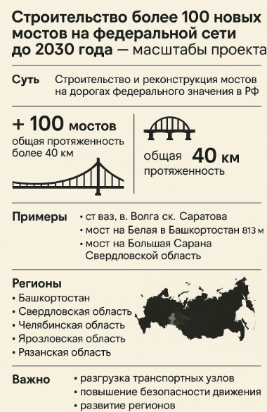Главные задачи программы: Хотя полный перечень из 100 + мостов пока не опубликован, в числе отдельно упомянутых объектов следующие: В источниках указано, что активные работы по мостам идут в таких регионах, как: Точные сроки ввода каждого из мостов пока не раскрыты для всех объектов — программа заявлена до 2030 года.