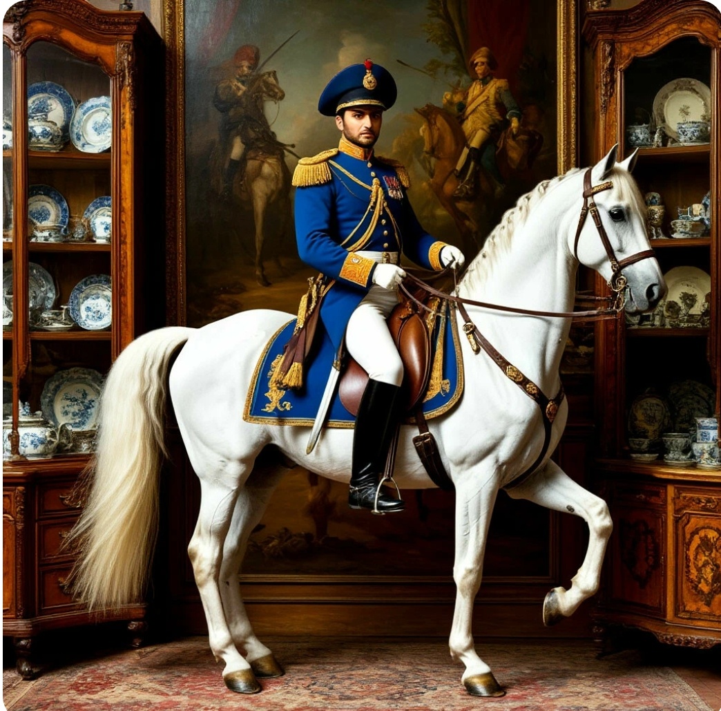 Ничего необычного: заставленная предметами (как и всё в этой комнате) стена не имела никаких намёков на дверной проем. Боковые ее части были завешены картинами, в центре красовалось большое батальное полотно с героического вида военным, который, явно красуясь и позируя, сидел на белой лошади с узнаваемым щучьим профилем.