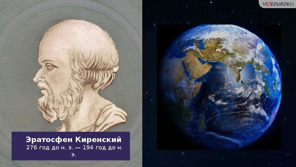 Древнегреческий астроном Эратосфен Киренский доказал, что Земля имеет форму шара, в 240 году до н.э. Он также ввёл понятия широты и долготы и смог вычислить окружность Земли, которая отличается от современного значения в 40 041 км менее чем на 2 %.