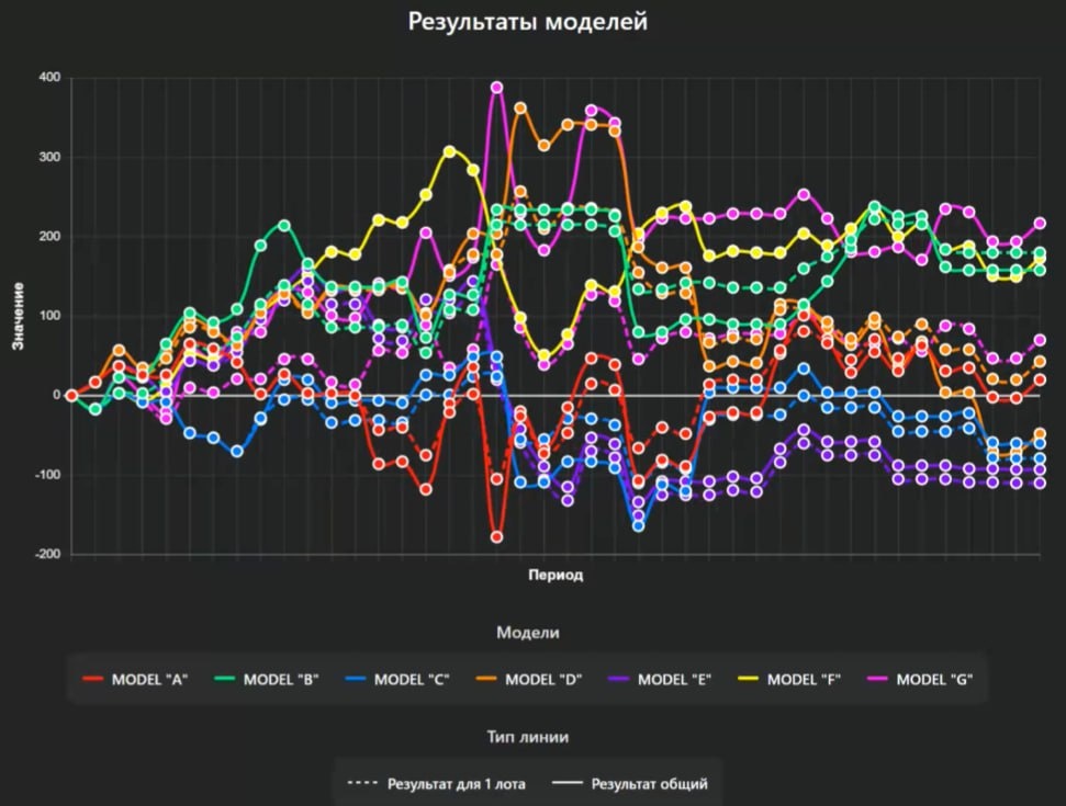 📊 14.11.2025 ┌──────┬────────┬──────┬────┬────────┬────────┐ │МОДЕЛЬ│ПРОГНОЗ │ ВЕР. │ЛОТ │ 1 ЛОТ │ ИТОГ │ ├──────┼────────┼──────┼────┼────────┼────────┤ │ A │ Ниже↓ │ 0.62 │ 1 │ 23 │ 23 │ │ B │ Ниже↓ │ 0.56 │ 0 │ 0 │ 0 │ │ C │ Ниже↓ │ 0.55 │ 0 │ 0 │ 0 │ │ D │ Ниже↓ │ 0.60 │ 1 │ 23 │ 23 │ │ E │ Выше↑ │ 0.50 │ 0 │ 0 │ 0 │ │ F │ Ниже↓ │ 0.65 │ 1 │ 23 │ 23 │ │ G │ Ниже↓ │ 0.65 │ 1 │ 23 │ 23 │ └──────┴────────┴──────┴────┴────────┴────────┘ Результаты с 15.09.2025 по 14.11.2025 📅 ┌────────────┬───────┬────────┐ │ Модель │ 1 лот │ Общий │ ├────────────┼───────┼────────┤ │ MODEL "A" │ 20 │ 20 │ │ MODEL "B" │ 180 │ 158 │ │ MODEL "C" │ -79 │ -60 │ │ MODEL "D" │ 43 │ -48 │ │ MODEL "E" │ -110 │ -93 │ │ MODEL "F" │ 173 │ 173 │ │ MODEL "G" │ 70 │ 217 │ └────────────┴───────┴────────┘