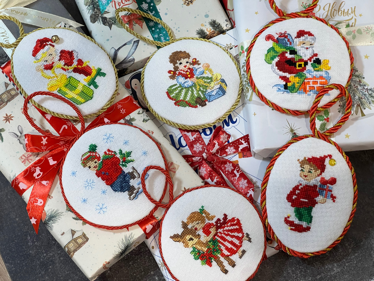Сегодня хочу поделиться с Вами, как сделать новогоднее украшение из вышивки! Для этого нам понадобится: Перейдем непосредственно к созданию пинкипа. Для начала нам нужна вышивка. У меня она выполнена крестиком на равномерной канве нитками мулине. У меня на фото вышивка уже натянута. Подробнее об этом напишу ниже. Из листа А4 нужно сделать 3 шаблона: 1) для картона - ровно по размеру будущего пинкипа - в моем случае для круглой вышивки слева нужен шаблон диаметром 9 см 2) для синтепона - на 0,5 см меньше - в моем случае диаметром 8,5 см 3) для вышивки и ткани - на 3 см больше, чтобы был запас по краям - в моем случае диаметром 12 см С помощью шаблона вырежьте круги из пивного картона и синтепона. Далее необходимо укрепить заднюю сторону вышивки клеевым флизелином. Также поступить с тканью для оборотной стороны пинкипа. После этого нужно вырезать их по шаблону. После этого соберите слои в следующем порядке: сначала вышивка/ ткань лицевой стороной вниз, затем синтепон, в последнюю оче