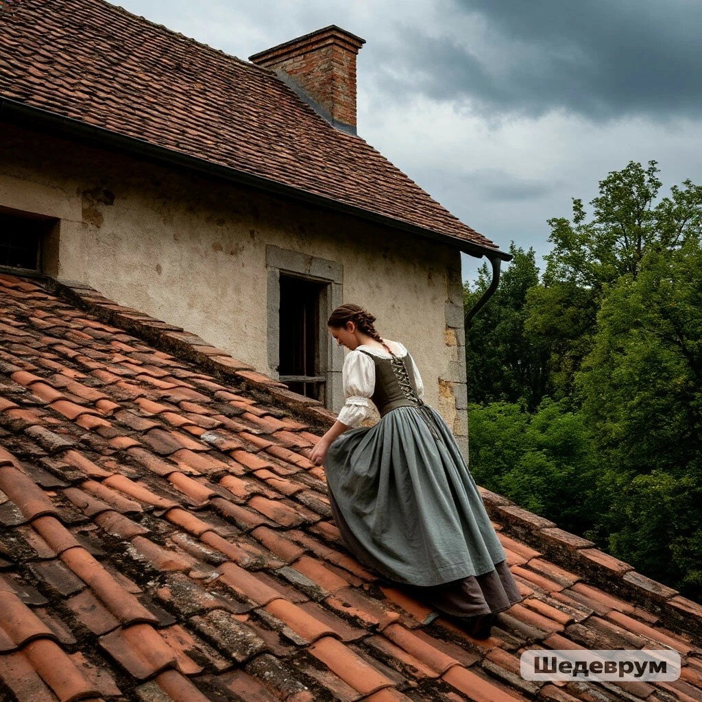 Осторожно прислонила лестницу, чтобы она не упала под моим весом, засунула в пояс сколько влезло черепицы, и ступила на первую перекладину. Она натужно скрипнула под ногой, обещая развалиться в любой момент.