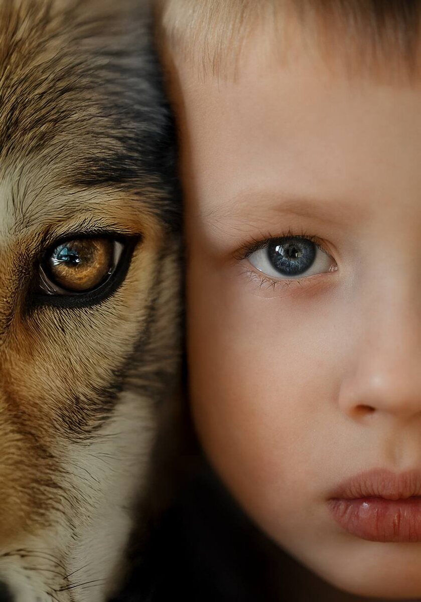 Две половины одного снимка. Одна маска, но два лика. Маленький ангел и дикий зверь. Нежная кожа и грубая шерсть. Беззащитность и сила. Диалог между ангельской сущностью и звериным началом.