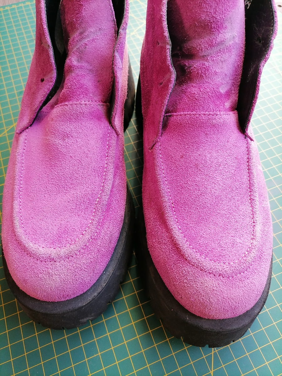 Всех приветствую! Сегодня расскажу как почистить обувь из замши. Это можно спокойно сделать дома, но нужно будет кое что прикупить... Приведу пример на этой паре Сначала берем каучуковый ластик, и начинаем вычищать загрязнения При сильных загрязнениях и засалах, я использую очистители (эфирка от Ранги) Они эффективны но нужно доп оборудование. Понадобится компрессор и пистолет для продувки Намачиваем тампон из бинта, выжимаем, и полусухим начинаем чистить. Чтобы не было разводов, после каждого применения продуваем. Далее, лишний ворс можно состричь наждачной бумагой на 600-800 Ну вот почти готово Берем жировку. Я использую от фирмы Ранга или alberti angelo Наносим легким увлажнением через краскопульт, либо через распылитель. Жировка вытягивает первоначальный цвет изделия. Таким образом, мы обходимся без покраски обуви Ну вот и готово! Чуть не забыл!!! Обязательно пройтись гидрофобом