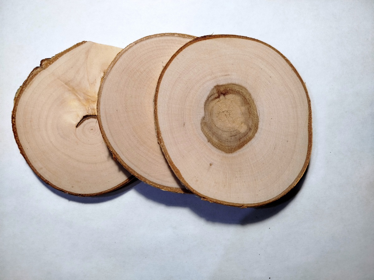 Всем творческий привет! Сегодня я покажу еще один способ декорирования елочных игрушек из спилов дерева. У меня есть березовые спилы диаметром 8 и 9 см, они довольно легкие, так как их толщина составляет всего 7-8 мм. Однако у спилов есть небольшие дефекты, поэтому перед покраской необходимо обработать все неровности шпатлевкой. После выравнивания поверхности шпатлевкой, я нанесла белую краску на одну сторону спила. Вторую половину спила я решила оставить без декора. Перед тем как приклеить распечатки, я их истончила с помощью скотча. Приклеила распечатки на спилы и покрыла лаком на несколько слоев с просушкой. Не стала вкручивать в тонкие спилы шурупы с крючками, а на обратную сторону прикрепила подвесы. Подготовила состав из краски + крахмал + клей ПВА. Этим составом прохожусь по краю спилов, имитируя снег. Немного расписала картинки контурами и добавила блестки. К подвесам привязала тонкую ленточку и кусочек ленточки приклеила на металлическую поверхность подвеса. Горячим пистолетом