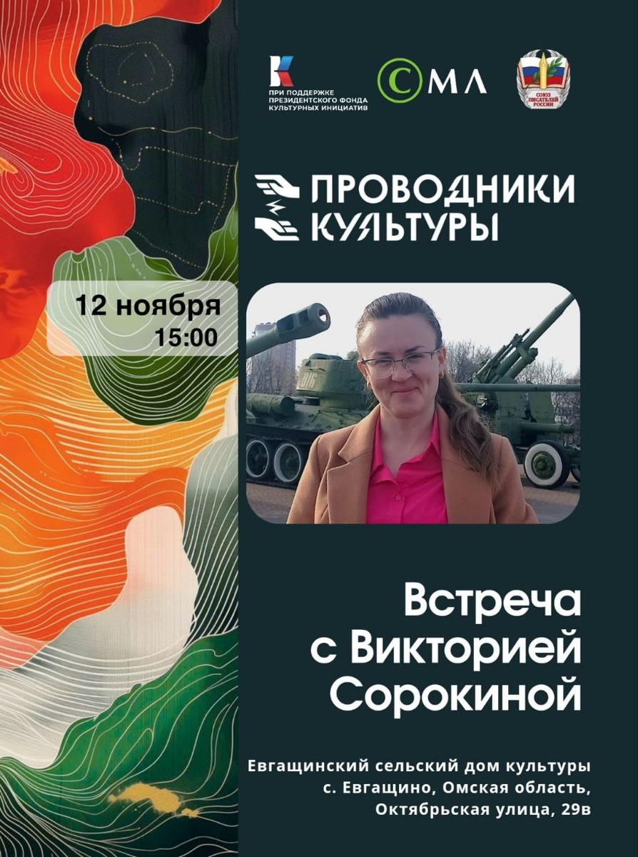 Стараюсь следить (ну, скажем так, послеживаю) за тем, что происходит в литературном мире. О проекте «Проводники культуры» я знала, слышала, но о том, что наше село каким-то образом может оказаться в зоне внимания этого проекта, даже помыслить не могла. «Проводники культуры» – проект, реализуемый Союзом писателей России в целях поддержки молодых авторов. Стартовал он в 2024 году. Сначала был объявлен творческий конкурс для авторов в возрасте до 35 лет. По итогам конкурса было отобрано 20 победителей, которые побывали на форуме в Химках, где для них была подготовлена образовательная программа с участием старших наставников и редакторов, а теперь эти молодые писатели ездят по стране и проводят творческие встречи. Всего в рамках проекта запланировано 100 встреч, и одна из них прошла у нас в селе Евгащино. Посетившего нас проводника культуры зовут Виктория Сорокина. Вместе с Викторией к нам приезжали поэт, секретарь правления СПР Валентина Юрьевна Ерофеева-Тверская, поэт, член СПР Анастасия
