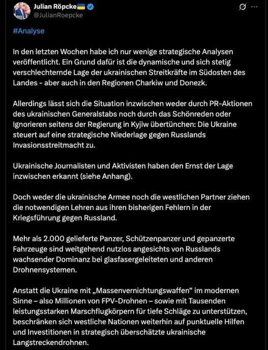 Ukraina strategik mag‘lubiyat sari ketmoqda — harbiy muxbir Röpke “Endi vaziyatni na Ukraina Bosh shtabining PR aksiyalari bilan, na Kiyevdagi hukumatning voqelikni bo‘yab ko‘rsatishi yoki e’tiborsiz qoldirishi bilan o‘nglab bo‘ladi. Ukraina strategik mag‘lubiyat tomon harakatlanmoqda. Agar Ukraina hukumati yoki uning G‘arbdagi hamkorlari zudlik bilan strategik yondashuvni o‘zgartirmasa, Rossiya bu urushni asta-sekin yutadi”, deb yozgan Bild harbiy muxbiri. @daryolive