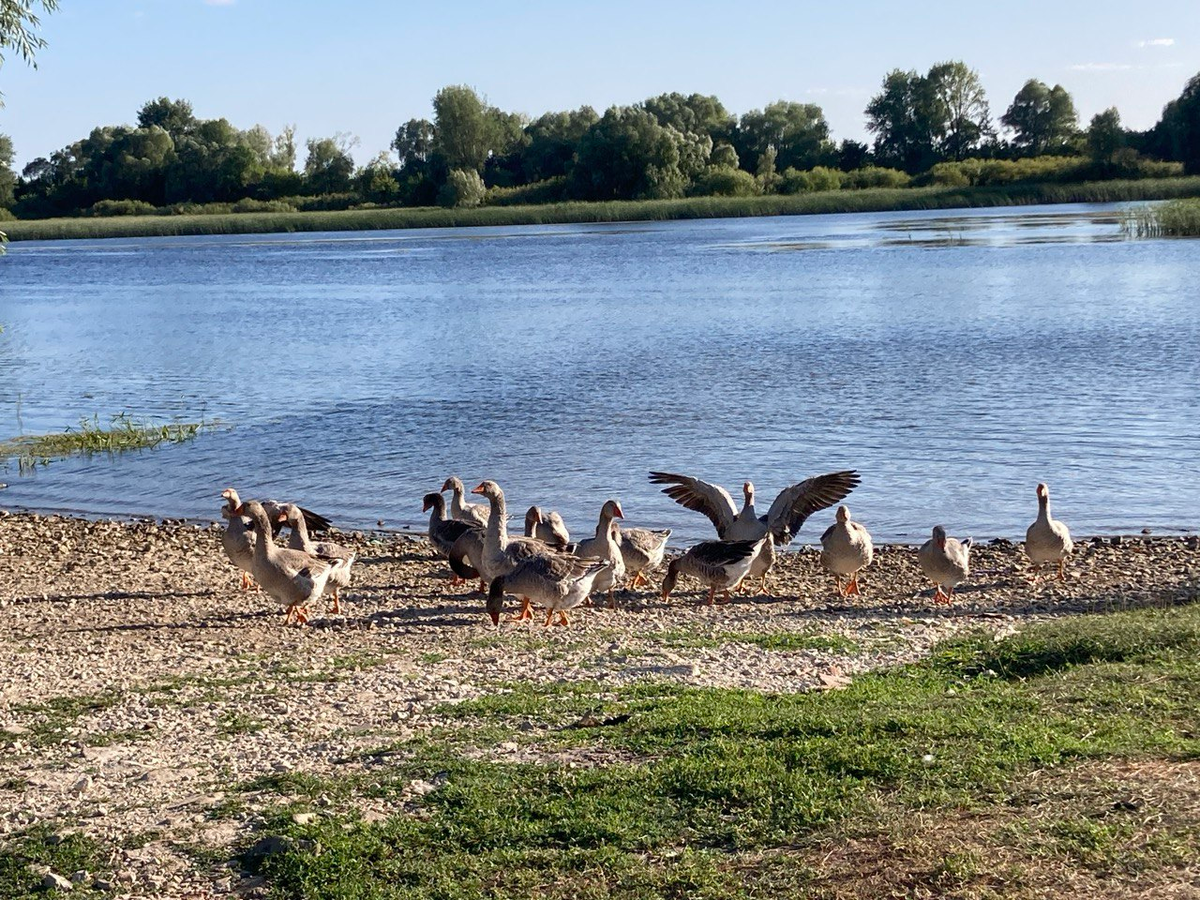 В веселой детской песенке про гусей поется «Жили у бабуси два веселых гуся, один-серый, другой-белый, два веселых гуся. У жительницы нашей деревни, Полины, целая стая серо-белых гогочущих и говорящих на разный лад гусей. Так и хочется спеть оду деревенским длинношеим: «Жили у Полины тридцать три гусыни, серо-белые гусыни, гуси-гоготуси...» Рано утром у реки всегда встречают дружной песней и танцами наши деревенские заводилы-гуси. Чистые и опрятные, после утренних речных камышовых ванн, легкого вегетарианского салата из щавеля, одуванчика и подорожника, гуси идут вразвалочку, важно виляющей походкой, величественно приветствуют утренним горном. Конечно, кто бы поспорил, они ж начальники пляжа и должно пройти контроль. Чтобы попасть к реке и освежиться, проверку не миновать. Умные Полинины гоготуси чувствуют чужака за версту. Узнают по походке, голосу и настроению, чувствуют с каким намерением направляешься к священной реке. Уж если признали своих, то будут охранять и оставленные на бере