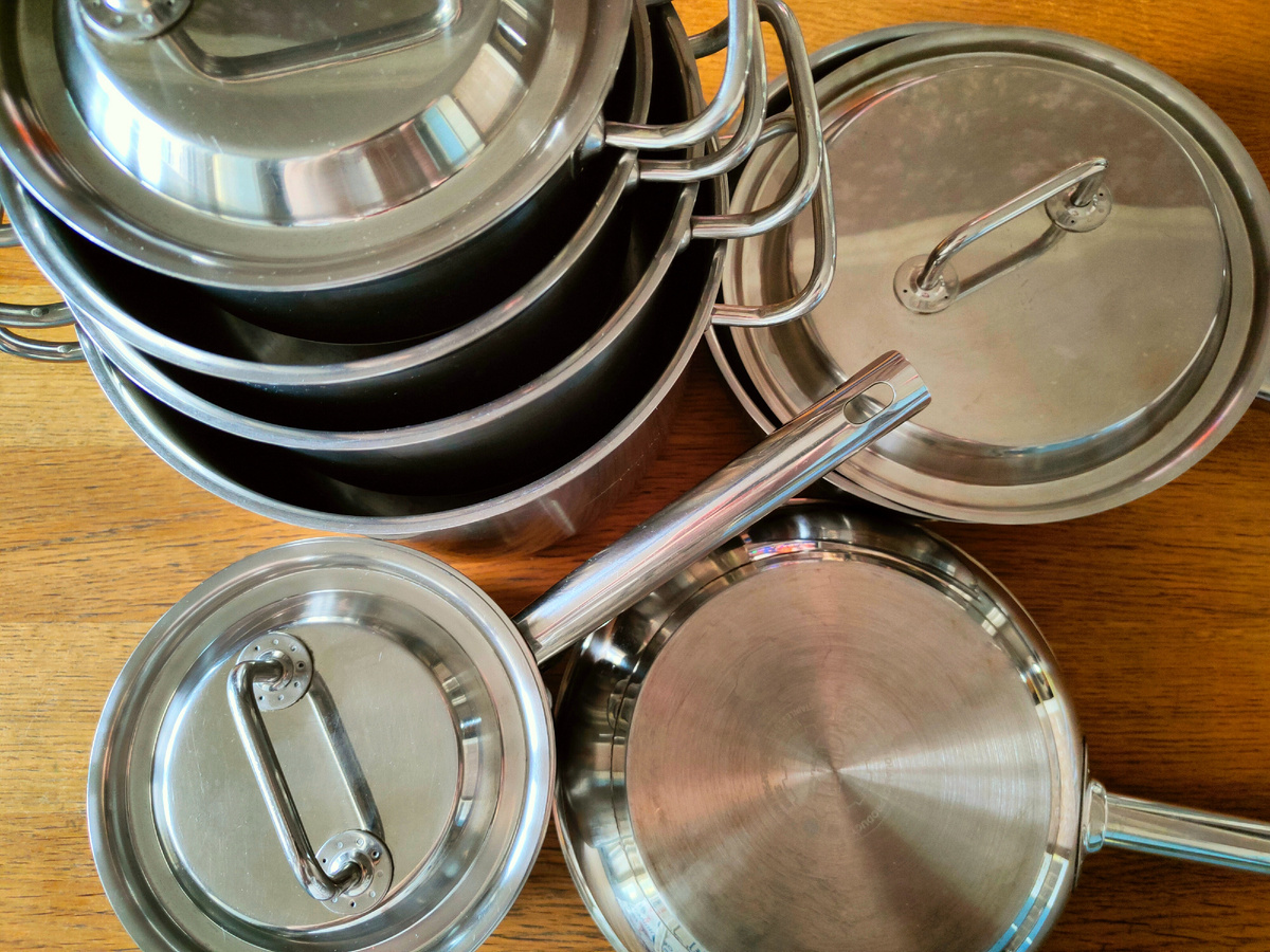 - кастрюли с прямыми стенками, не "пузатые", что позволяет их хранить одну в другой;