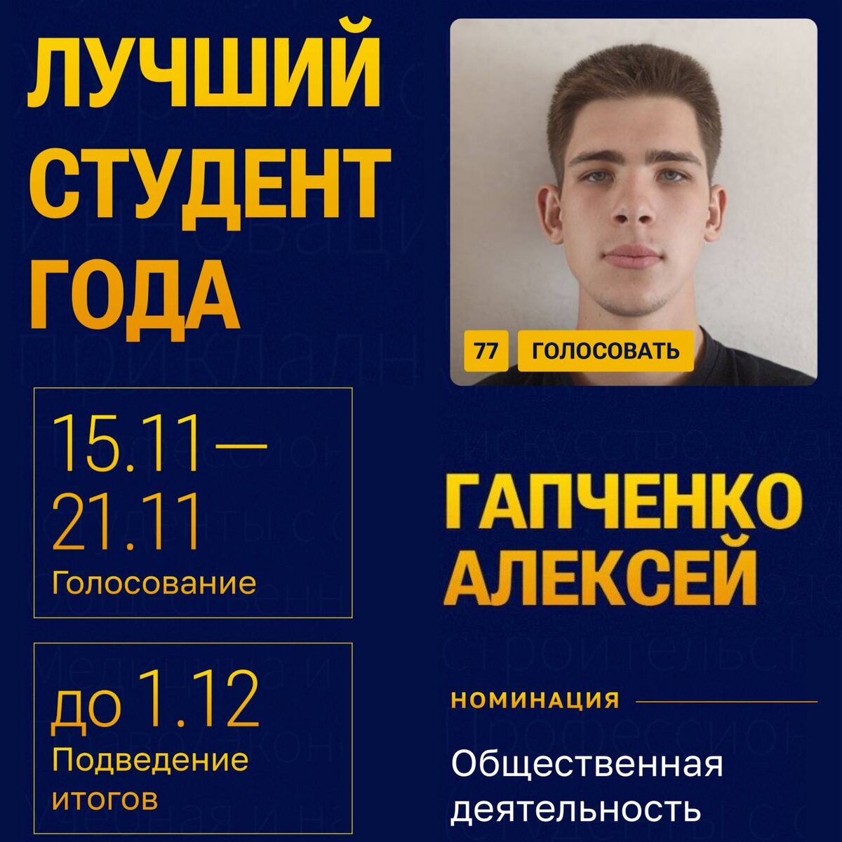 Дорогие друзья! 🎓 Студент Губкинского филиала НИТУ «МИСИС» Алексей Гапченко участвует в конкурсе «Лучший студент года», организованном фондом «Поколение» Андрея Скоча, и представляет наш филиал в номинации «Общественная деятельность». Алексей - ответственный и целеустремленный студент, активный участник городских общественных инициатив и патриотических акций. У нас серьезные соперники, но мы знаем - когда мы едины, мы непобедимы! Давайте вместе поддержим Алексея и подарим ему шанс на победу! ⚡️ ВАЖНО! Голосование открыто только для абонентов сотовой связи, зарегистрированных в Белгородской области. ⏰ Голосование продлится до 21 ноября 2025 года. 🔗 Как проголосовать: 1. Переходите по ссылке. 2. Регистрируйтесь. 3. Подтверждаете контакт в Telegram. 4. Обновляете страницу на сайте. 5. Прикрепляете профиль в VK. 6. Снова обновляете страницу. 7. Голосуете! Если что-то не получается — сотрудники студенческого офиса готовы помочь!