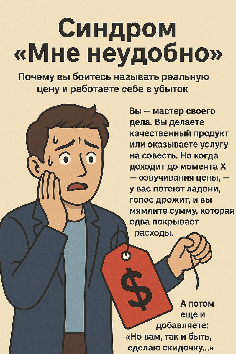 Вы — мастер своего дела. Вы делаете качественный продукт или оказываете услугу на совесть. Но когда доходит до момента X — озвучивания цены, — у вас потеют ладони, голос дрожит, и вы мямлите сумму, которая едва покрывает расходы. А потом еще и добавляете: «Но вам, так и быть, сделаю скидочку...».