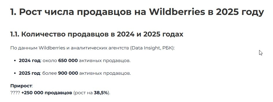 Штормить ВБ началось года полтора назад. Но 2025 год - это даже не шторм. Это уже ураганный ураган. Привет всем! Меня зовут Марина, и в январе будет 4 года, как я работаю менеджером на данной торговой площадке. Этой весной я сама вышла на неё в роли селлера. А не так давно я дополнительно обучилась профессии маркетолог-аналитик в одном флаконе.😊 В общем, положила яйца в несколько корзин.) Но припасла и еще одну корзину.) К слову сказать, мне настолько понравилось обучение, что я тут же развернулась на следующий поток.😉 Теперь к теме статьи. По статистике самого ВБ, количество продавцов в 2025 году выросло на 38,5 %. Причин для такого роста было несколько. Тут и упрощение регистрации на ВБ, и расширение логистики, и, конечно же, рост популярности самой площадки.