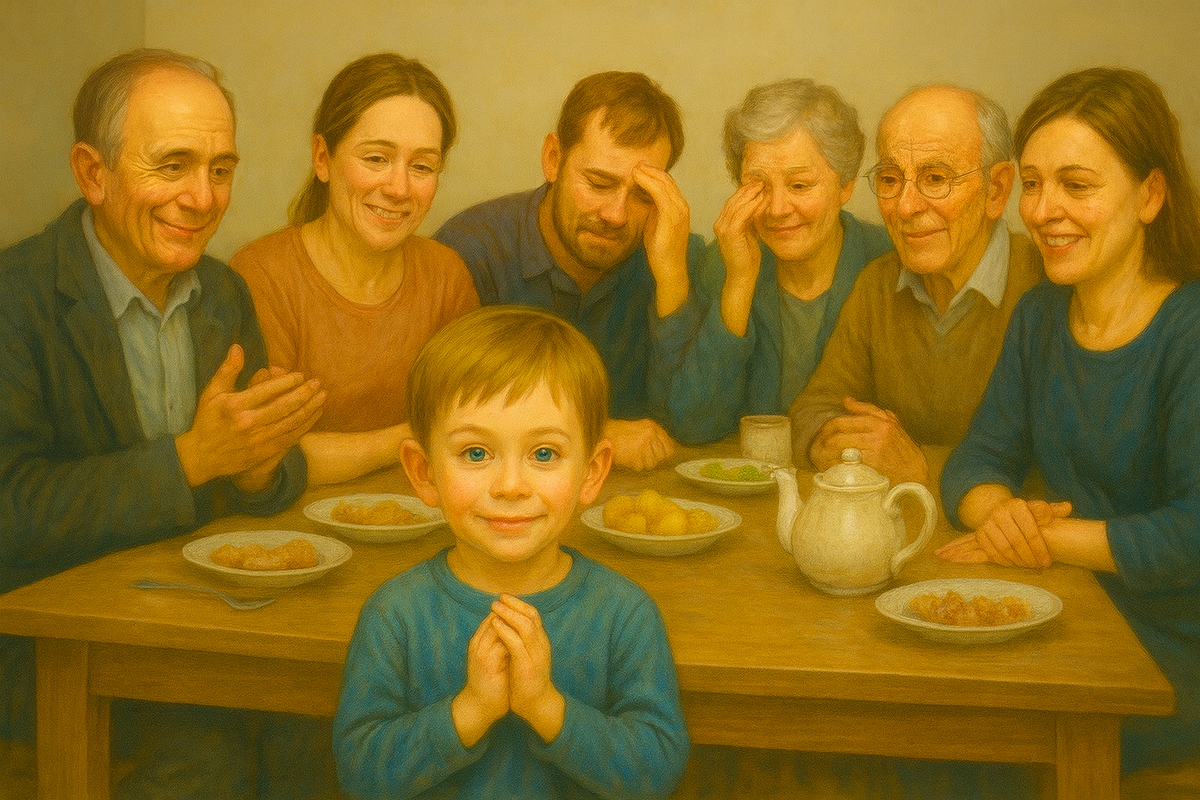 Димка подумал, что наступил какой-то очередной праздник: все собрались за большим накрытым столом. Но почему-то все напряжённые и подарки никому не дарят, а все по очереди смотрят на него и грустно улыбаются. А дед ещё зачем-то постоянно в ладоши хлопает.