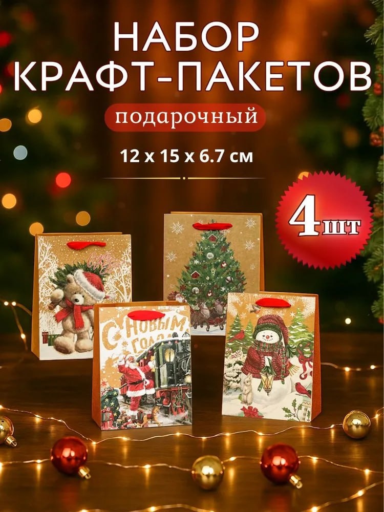 Набор подарочных крафтовых пакетов 15х12х6.7 см, 4 шт. Комплект новогодних подарочных крафтовых пакетов с изображением: снеговика, деда мороза, новогоднего мишки и новогодней елки. Цена: 140 руб. Ссылка: https://ozon.ru/t/8D1BnDZ