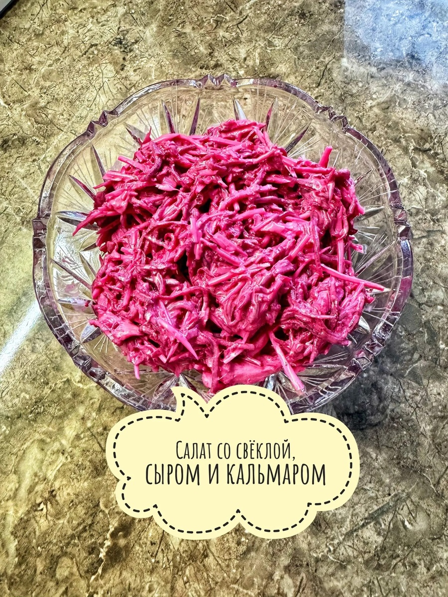🦑🩷🦑 Такой необычный салат со свеклой. Интересный, вкусный. 👩🏻🍳Ингредиенты: Свекла отварная или запеченная-1 штука Кальмары в масле (пресервы)-150 грамм Чеснок 1 зубчик через чеснокодавилку Сыр твердый 70 грамм (у меня Пармезан) Соль по вкусу Для заправки: Майонез смешать со сметаной по вкусу. 👩🏻🍳Приготовление: Смешать в миске кальмаров без масла, натёртый сыр, натертую свеклу, посолить салат по вкусу немного, добавить пропущенный через пресс чеснок и майонез+ сметану. Сыр и свекла на терке для корейской моркови. Не мелко. Перемешать. И подавать. Очень вкусно. Приятного всем!!