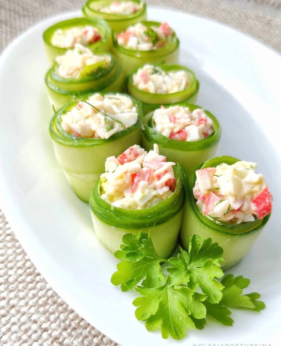 А можно и как закуску на праздничный стол подать😜. Сохраняйте обязательно, вам понравится. ⠀ Выход 290г. ⠀ КБЖУ на 100г.: 92/6.6/5.5/3.8. ⠀ КБЖУ на всю эту большую порцию всего 267/19.2/15.9/11. ⠀ Ингредиенты: - 120г огурца (огурец был больше, не все полосочки получились) - 60г крабовых палочек (3шт., можно взять креветки, курицу, тунец и тд) - 1 вареное яйцо - 25г сметаны 15% - 3г горчицы - 20г сыра - пару веточек укропа - сухой чеснок по вкусу - пара капель сока лимона - соль. ⠀ Приготовление: Огурцы нарезать слайсами. Можно ножом, но я воспользовалась овощечисткой. Палочки, яйцо, зелень мелко нарубить. Сыр натереть. Смешать сметану, горчицу, сок лимона и соль - получилась заправка. Смешать все кроме огурцов - получилась начинка. Выложить начинку на огурцы и завернуть. У меня слайсы были тонкие и очень хорошо держалось. Если не держатся - скрепите зубочистками.