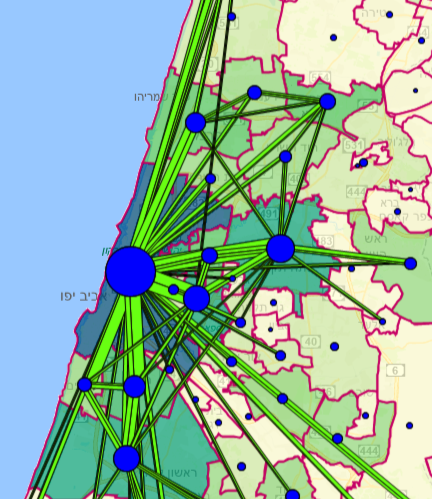 Какой из типов связностей более сильный - зависит от задачи. Ниже карта ежедневнего утреннего коммьюта в центральном регионе Израиля: круги - это города , линии - направления коммьюта. Самый большой из кругов - это Тель-Авив, на востоке от него, 2ой по величине, на востоке от него, - это Петах-Тиква. И вот вопрос: если бы Covid-19 начался бы в Петах-Тикве, куда бы он быстрее распространился: в ближайший к Петах-Тикве Кириьят Оно или в Тель-Авив?