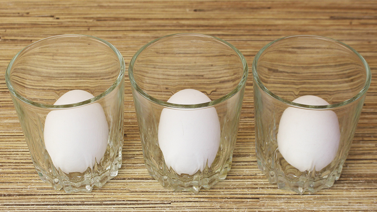В каждый стакан аккуратно разбейте по одному сырому куриному яйцу. Этот метод порционной готовки очень удобен.