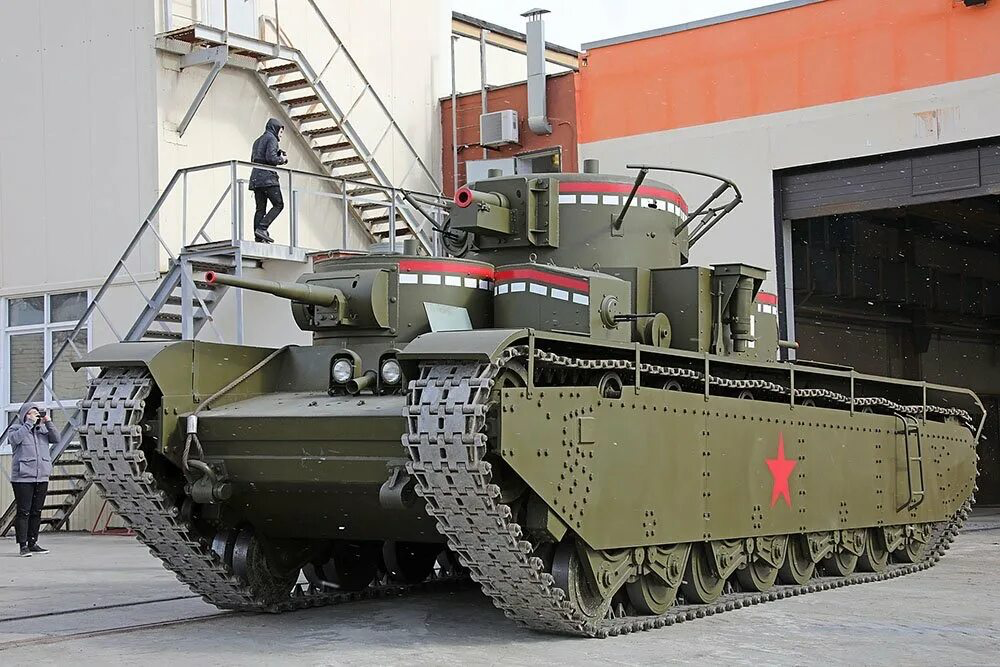 Особенности: Громоздкая конструкция и слабая броня делали танк уязвимым. Технические проблемы, такие как ненадёжная трансмиссия и высокий расход топлива (300 л/100 км), ограничивали его эффективность. В боях 1941 года все Т-35 были потеряны из-за поломок или уничтожения немецкой артиллерией и танками.