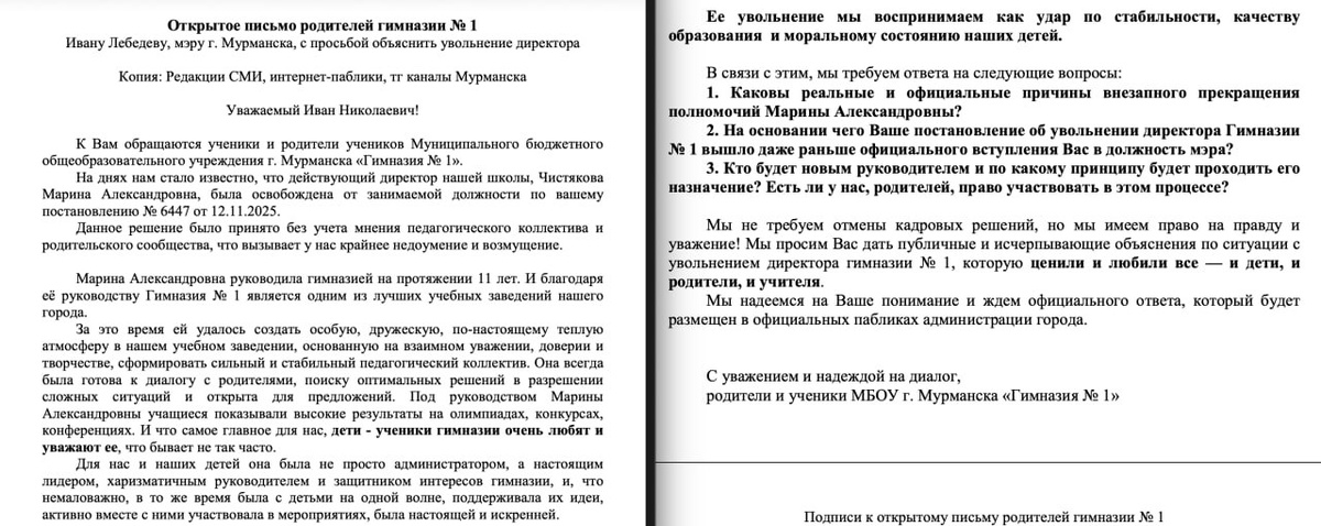 В ответ на пост Пока Иван Лебедев открывал ёлку, родители учащихся гимназии № 1 написали открытое письмо в адрес мэра, в котором требуют (и правильно делают) публичного и исчерпывающего объяснения причин увольнения директора учебного заведения Марины Чистяковой. В письме, в частности, говорится: Марина Александровна руководила гимназией на протяжении 11 лет. И благодаря её руководству Гимназия № 1 является одним из лучших учебных заведений нашего города. <...> Ее увольнение мы воспринимаем как удар по стабильности, качеству образования и моральному состоянию наших детей. Кроме того, родители организовали живой сбор подписей под этим обращением. ❄ «Арктический Обозреватель» следит за развитием ситуации и при необходимости окажет всестороннюю информационную поддержку.