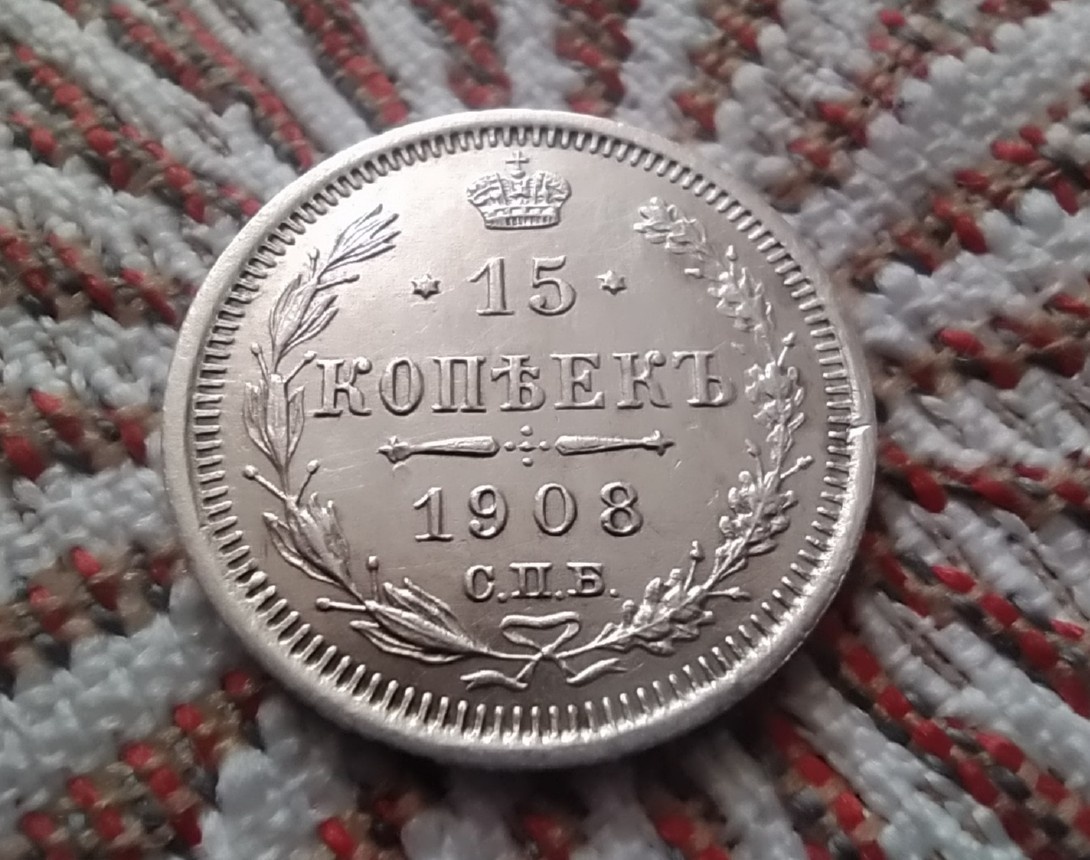 - Пятиалтынный, - говорили про эту монету. В моей коллекции монета 15 копеек 1908 года выглядит вот таким образом: Полное наименование - 15 копеек 1908 года СПБЛ ЭБ. Как я писал в предыдущей публикации - серебряных монет времен Империи у меня немного, а потому каждая монета в некотором роде дорогА для меня. И особенно я ценю те монеты, которые либо имеют очень хорошую сохранность, либо относятся к редким. Монета 15 копеек - довольно массовая, но в неплохой сохранности. Каталог под рукой мне подсказывает, что тираж данной монеты был 29 миллионов штук. Сама же монета оценивается в 500 рублей. Тираж - очень большой. Но и цена для такого тиража вполне достойная. И всякий раз для проверки цены я заглядываю на барахолки, чтобы найти там монеты в аналогичном состоянии и примерно узнать цены, из которых я уже по собственной формуле вывожу реальную цену. На "мешке" монеты в подобном состоянии продаются по цене от 500 рублей (как в каталоге). Но как оценить состояние? Я думаю, в первую очер