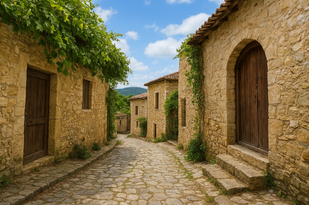 Старые каменные дома, стены в трещинах, лозы, тянущиеся по крышам, и запах — смесь кофе, свежего хлеба и тёплого воздуха. Никто не пытается что-то продавать.