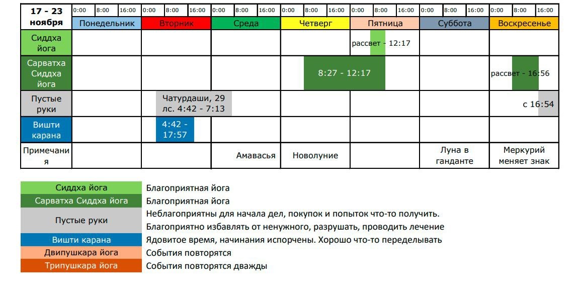 Неделя 17 - 23 ноября Часовой пояс GMT +3 (MSK) 🔸Солнце покинуло знак падения и вошло в дружеский знак Скорпиона, где находится Марс - хозяин знака. От этого Солнце станет ощутимо сильнее, что благоприятно должно сказаться на жизненной силе и здоровье. 🔸Меркурий, Юпитер и Сатурн ретроградный. 3 планеты обращают наше внимание в прошлое. Юпитер - чтобы мы поняли смысл прошлого, Сатурн - чтобы не ленились и доделывали, Меркурий - чтобы переосмыслили и доделали мелочи. Пока лучше не покупать гаджеты и перепроверять всю информацию по несколько раз. Лучше лишний раз убедиться, что собеседник понял вас правильно. 🔹Понедельник - последний благоприятный день в лунном цикле. Мягкий по атмосфере, подходит для оздоровления, работы над телом, конструирования, творчества. Заканчиваем дела 🔹Вторник - самые тёмные лунные сутки. Очищаемся, избавляемся от лишнего. Не надо принимать предложений, покупать, спорить, начинать новое. 🔹Среда - луна в Вишакхе хороша для церемоний, сутки Амавасья - для п