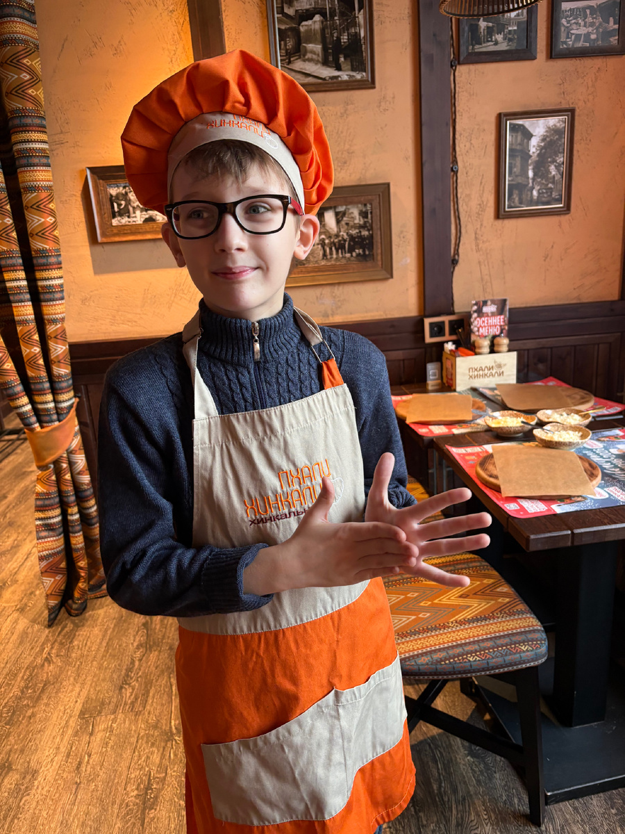 Есть у нас на набережной любимый грузинский ресторанчик известной сети. Много раз обращала внимание на то, что они проводят детские мастер-классы. Но моя внутренняя неуверенность в том, что мы достаточно хороши и адекватны для такого мероприятия, останавливала меня от участия. Но боги маркетинга не дремлют! Разместили видеорекламу с роликами таких мастер-классов прям у входной двери в ресторан. И что вы думаете? Правильно! Товарищ сам сказал, что ему туда надо! А то от этой скромной закомплексованной мамы пока дождешься… И вот настал день Х! Прям как в «Денискиных рассказах» мой товарищ не посрамил фамилию и не ел рыбу ножом. С двумя прелестными юными дамами они облачились в поварские шапочки и фартуки и под предводительством повара приступили к делу. Я первые минут пять присутствовала, фотографировала, снимала, а потом тихонечко ретировалась за свой столик, чтобы не смущать юных поваров. Каждый поваренок сделал по четыре розовых хинкали с сыром. Потом они дружной вереницей отне