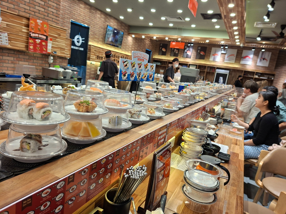 Привет-привет, друзья! Сегодня поделюсь впечатлениями от посещения ресторана японской кухни Micado sushi в солнечном Нячанге 😋✨ Это было неожиданное путешествие в мир вкуса и аромата Японии прямо посреди Вьетнама! Ресторан увидели совершенно случайно и решили тут же зайти в него. Интересно же. О таком ресторнане видела ролики в сети. Кайтен-дзуси — ресторан японской кухни, где блюда перемещаются по конвейерной ленте прямо перед клиентами. Кайтэн-дзуси (с японского дословно переводится как «вращение + суши») — тип суши-ресторана с ленточным конвейером. Также такие заведения называются «суши-карусель» или «конвейерный суши-ресторан» ☀️ Мы зашли внутрь и замерли. Первое, что бросилось в глаза — движущаяся лента с тарелочками, наполненными свежайшими блюдами. Настоящий конвейер счастья 😄 Каждвя тарелочка накрыта прозрачной крышкой, как маленький тортик. Под крышкой чудеса гастрономии. Подходит менеджер, спрашивает, из какой страны, дает лист с инструкцией. Все понятно. каждая