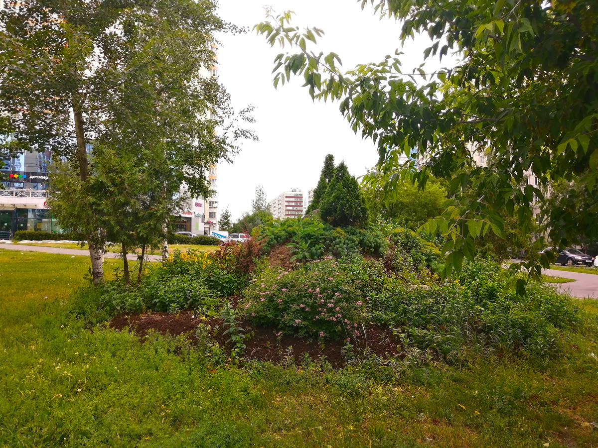 Но получилось почти красиво, не смотря на кое-какие ляпы. На самом деле, конечно, не альпийская. Да, горка, да, каменистая. Но горка городская, можно сказать, просто декоративная. Высота примерно 1,5м. Обошла не вокруг, но с другой стороны заглянула. Не заходя на газон. С другой стороны вид иной. То есть, со стороны проезжей части вид более козырный, чем с основной пешеходной. Камни большие заметны лучше. Некоторые глыбы и не на горке лежат, а рядом. Но видно, что к композиции "привязаны". На этот камень я сначала подумала, что он маскирует что-то. Но вроде нет? Или он очень хорошо сделан. Камни с виду более-менее одного вида (цвет, порода, следы обработки или их отсутствие). Это хорошо, нет разрозненности! Похоже, эту каменистую (не альпийскую!) горку создавали, максимально используя имеющуюся древесную растительность. А может, и камни там такие лежали? Раскопали где-то поблизости при строительстве. Хотя вряд ли. Раскапывают у нас чаще валуны и песчаник с известняком находят. Или ст