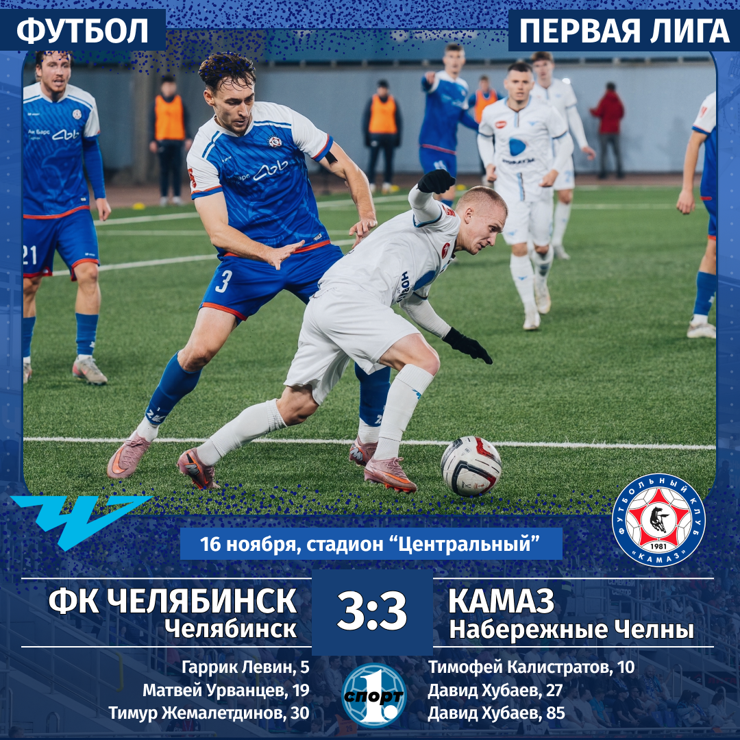 Футболисты «Челябинска» и «КАМАЗа» сыграли зрелищный и результативный матч в Первой лиге — один из самых ярких в сезоне. Уже в первом тайме к 30‑й минуте команды забили на двоих пять голов, а матч в итоге завершился вничью — 3:3. Гости ушли от поражения за 5 минут до финального свистка, сообщает корреспондент ИА «Первое областное». Обе команды одни из немногих в Первой лиге, которые ищут счастья в атаке, стремятся в первую очередь созидать на поле, а не разрушать действия соперника. Поэтому зрители в Челябинске вправе были ожидать зрелищного матча. Но в день игры город накрыло снегопадом, показывать в такую погоду яркую игру непросто. Однако футболистам было плевать на капризы погоды, они показали суперклассный футбол, особенно в первом тайме. Уже на 5-й минуте открыл счет в матче Гаррик Левин. Он получил хороший пас на ход от Булата Гатина и с острого угла (не без помощи рикошета от защитника) отправил мяч в ворота. Роман Мануйлов попытался было выбить мяч, но сделал он это уже после