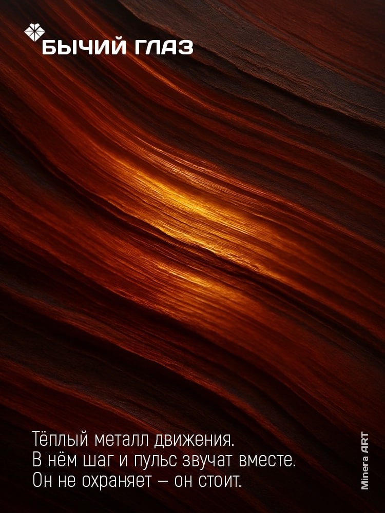 Бычий глаз — камень с теплом, которое не бросается в глаза, но ощущается сразу. Его глубокий красно-коричневый цвет с переливами — как жара, спрятанная в камне. Он не горит, а тлеет, как угли, которые держат тепло всю ночь. На ощупь он гладкий, прохладный, но в глубине будто хранит тихую энергию. При движении в нём проскакивает мягкий золотисто-рыжий отблеск — как свет, пробивающийся сквозь густую дымку. Он остаётся с тобой спокойно, без лишних слов, но даёт ощущение, что в нужный момент в нём есть сила, на которую можно опереться. ___________ Minera ART — направление, в котором мы пробуем почувствовать каждый минерал — и делимся результатом в своей группе.
