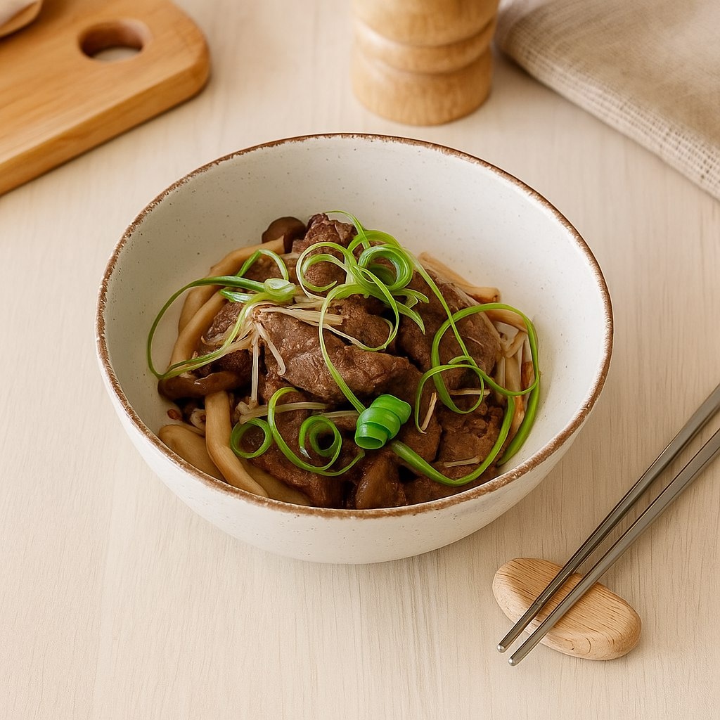 Пулькоги - популярное корейское блюдо, традиционно готовящееся из маринованной говядины, реже свинины или курицы, для подачи часто используют салатные листья, в которые заворачиваются рис и обжаренное мясо. Мне нравится вариант, в котором добавляются грибы и лук, и это скорее напоминает рагу. Для маринада потребуется: Одна груша или одно яблоко Соевый соус 6-7 столовых ложек 1 чайная ложка сахара Кунжутное масло 2 столовые ложки (в классическом рецепте оно обязательно, но при желании, я считаю, можно пренебречь) 1 столовая ложка сладкого вина/соуса мирина (если есть) 2 столовые ложки рисового уксуса 2 зубчика чеснока Все взбивается в измельчителе/блендере, мясорубка тоже прекрасно подойдет, чтобы сделать пюре из фруктов. Пропорции основных ингредиентов таковы: 500 гр вырезки, очень тонко нарезанной кружочками поперек волокон Зеленый лук 10-12 перьев Грибы (вешенки, еринги, эноки, можно шампиньоны) в любых сочетаниях 500 гр. Мясо следует мариновать от получаса при комнатной температуре