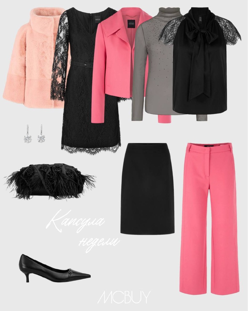Капсула недели 💖 Розовый и чёрный — вечный дуэт, который соединяет романтичность и силу. Эта капсула создана для ярких вечерних выходов. В центре — кружевное платье, топ с бантом и жакет насыщенного розового оттенка. Прозрачная водолазка со стразами добавляет блеска, а юбка и брюки — практичности и стиля. Мягкая шубка пастельного оттенка вносит лёгкость и делает образы более женственными. Сумка с перьями, лаконичные туфли и сверкающие серьги — завершают ансамбль с ноткой вечернего шика. Капсула доступна онлайн на сайте mcbuy.ru, а также в наших фирменных бутиках.