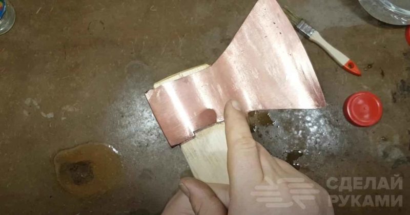 Таким образом, мы получим тонкий слой меди на стальном топоре. Это не только декоративное покрытие, как вы могли уже заметить (смотрится такой топор реально круто), но и дополнительная защита топора от коррозии. Вот такой лайфхак.