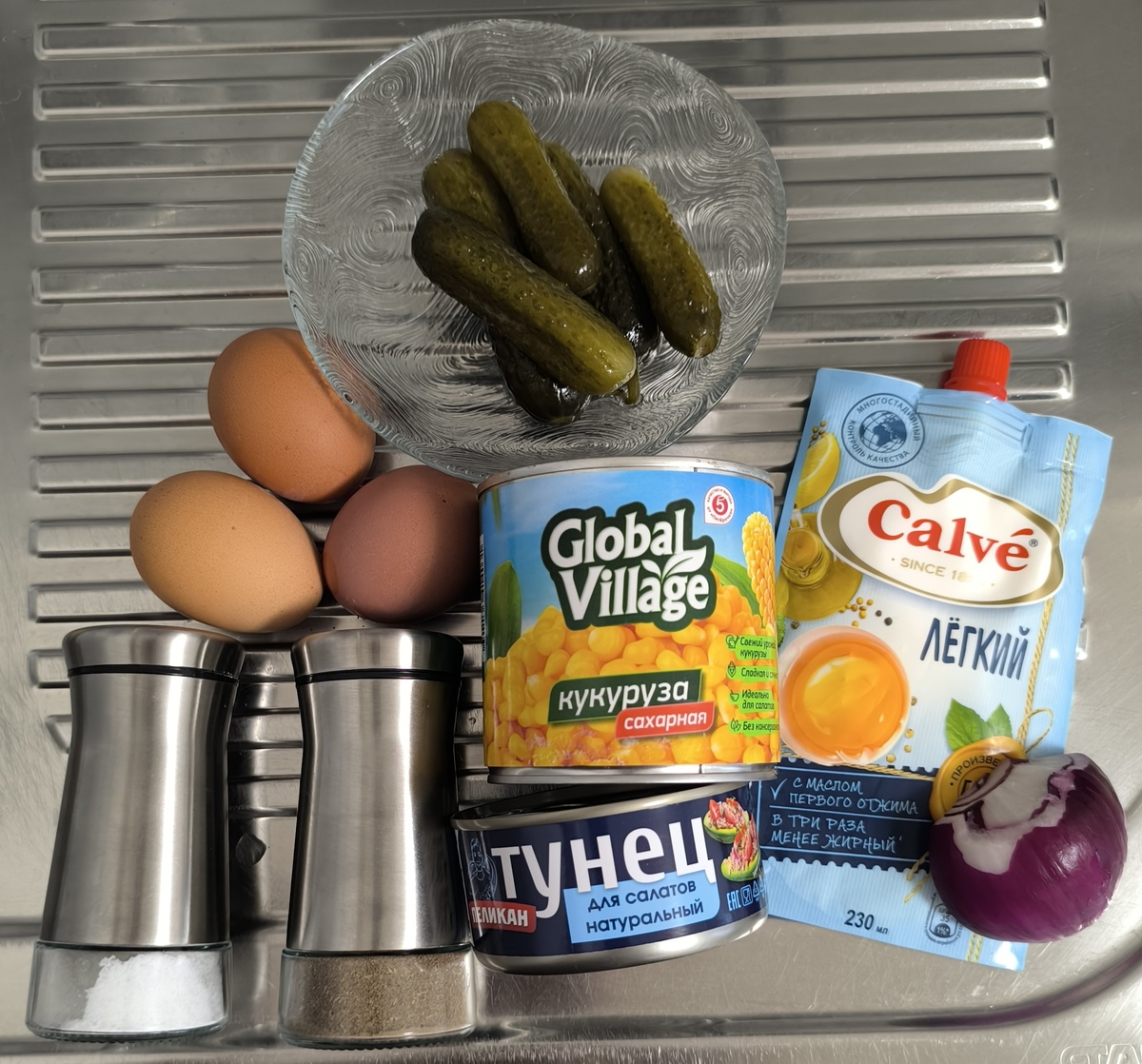 Сегодня мы приготовим салат, который смело можно назвать "гастрономическим аттракционом невиданной щедрости". Встречайте - "Тунец в шоке"! Ингредиенты (на 2‑3 порции безумного удовольствия): - консервированный тунец 1 банка (герой нашего кулинарного шоу); - кукуруза консервированная 1 банка (для сладкой нотки); - яйцо куриное 3 штуки (чтобы было сытно); - красный лук пол головки (для остроты ощущений); - солёные огурцы 2‑3 штуки (для хрустящего сюрприза); - майонез по вкусу (главный связующий элемент). Пошаговая инструкция (или "как не сойти с ума во время готовки") Яйца. Отварите их вкрутую (примерно 8‑10 минут после закипания). Затем остудите под холодной водой - пусть яйца немного "охладятся" перед вступлением в салатную симфонию. Нарежьте кубиками. Тунец. Откройте банку и аккуратно слейте жидкость. Вилкой разомните тунец до состояния "почти пюре, но не совсем". Представьте, что вы скульптор, а тунец - ваш материал для шедевра. Лук. Нарежьте красный лук полукольцами. Если боитесь