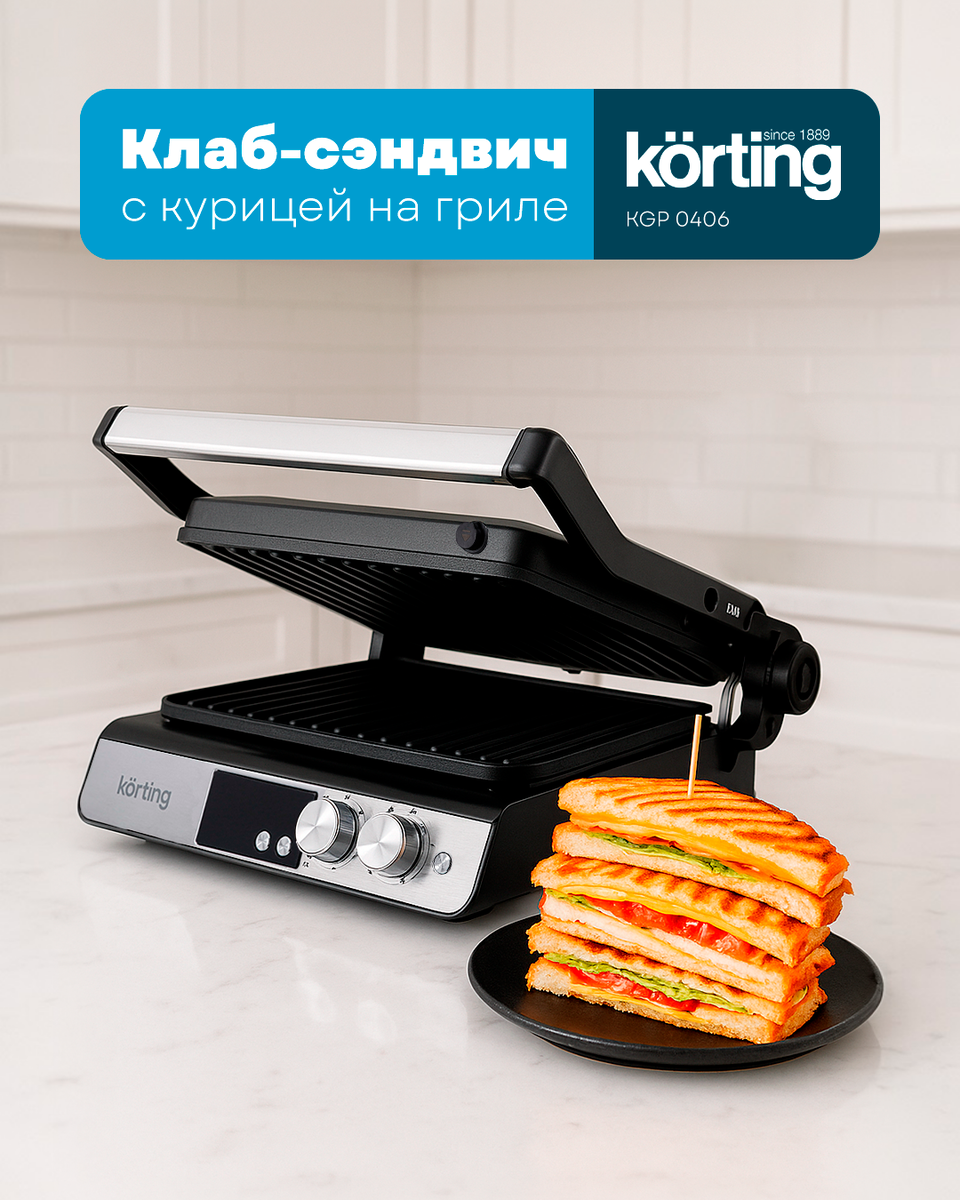 1. Посолите и поперчите куриную грудку, затем обжарьте её на гриле Korting KGP 0406 до золотистой корочки. Одновременно поджарьте ломтики бекона до хруста.