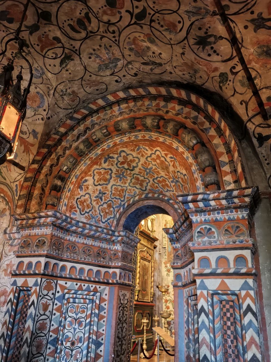 17.11.2025 Итак, преждевременно поднявшись на второй ярус, мы поняли, что совершили ошибку, потому что аудиогид продолжал рассказывать об экспозиции подклета. Посовещавшись, решили поставить гаджет на паузу и осмотреться. А потом сесть где-нибудь и прослушать экскурсию. Посмотрели все пределы, послушали песнопение в церкви Покрова Пресвятой Богородицы, походили по узким темным коридорам, вышли на площадки "гульбища", посетили комнату, где проходит выставка церковных экспонатов. Внутреннее пространство украшено красивой росписью с цветочным орнаментом. Как будто находишься внутри сказочного пряничного домика. В какие- то коридоры проникает дневной свет, другие освещаются фонарями и светильниками. Есть и совсем узкие, темные закоулки. На стенах изображения святых, которые можно рассмотреть если только сфотографируешь их через камеру телефона с функцией "ночь". В помещении , где проходит выставка, увидели вот такие экспонаты. Осмотрев все без суеты, включили а