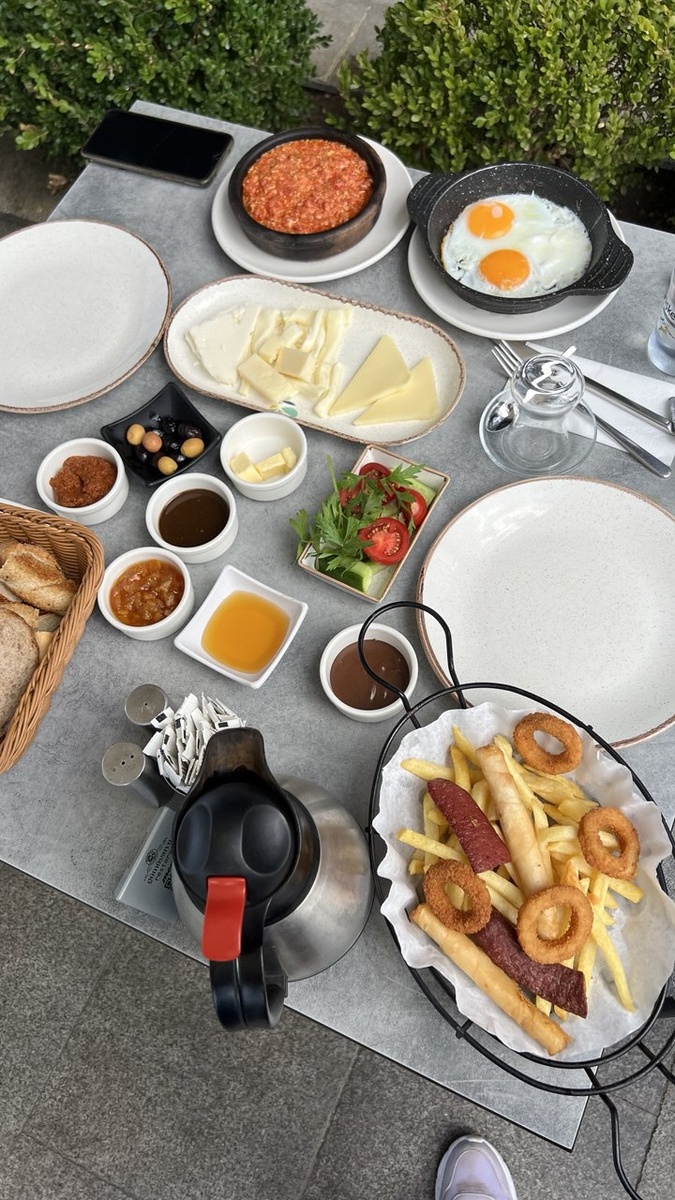 🍴 Турецкий Завтрак — Ловушка для Экспата: Главный Обман, Который Я Разгадала Я заметила, что турки очень консервативны в еде. Но если есть что-то святое, то это завтрак (кахвалты). Это не просто приём пищи, это СВЯЩЕННЫЙ РИТУАЛ! Он вроде бы одинаковый изо дня в день, но при этом такой разнообразный, что можно проводить экскурсии по одной только тарелке. Главное, что нужно усвоить: турецкий завтрак — это не про скорость. Это повод собрать за столом всю семью или большую компанию и провести как минимум ПОЛДНЯ, неспешно наслаждаясь яствами и болтовней. Сердцем любого турецкого завтрака, который мне пришлось полюбить (или возненавидеть?), является горячее блюдо. Тут царит яйцо. На простенькой тарелке в будний день это будет просто отварное яичко. Но в кафе есть целая карта яичных блюд. После горячего блюда в ход идут закуски. Стол должен ломиться! Я до сих пор не понимаю, как турки, которые едят СТоЛЬКО хлеба, умудряются от этого не толстеть! Это настоящие "ведьмы-турчанки"! :-) На "бога