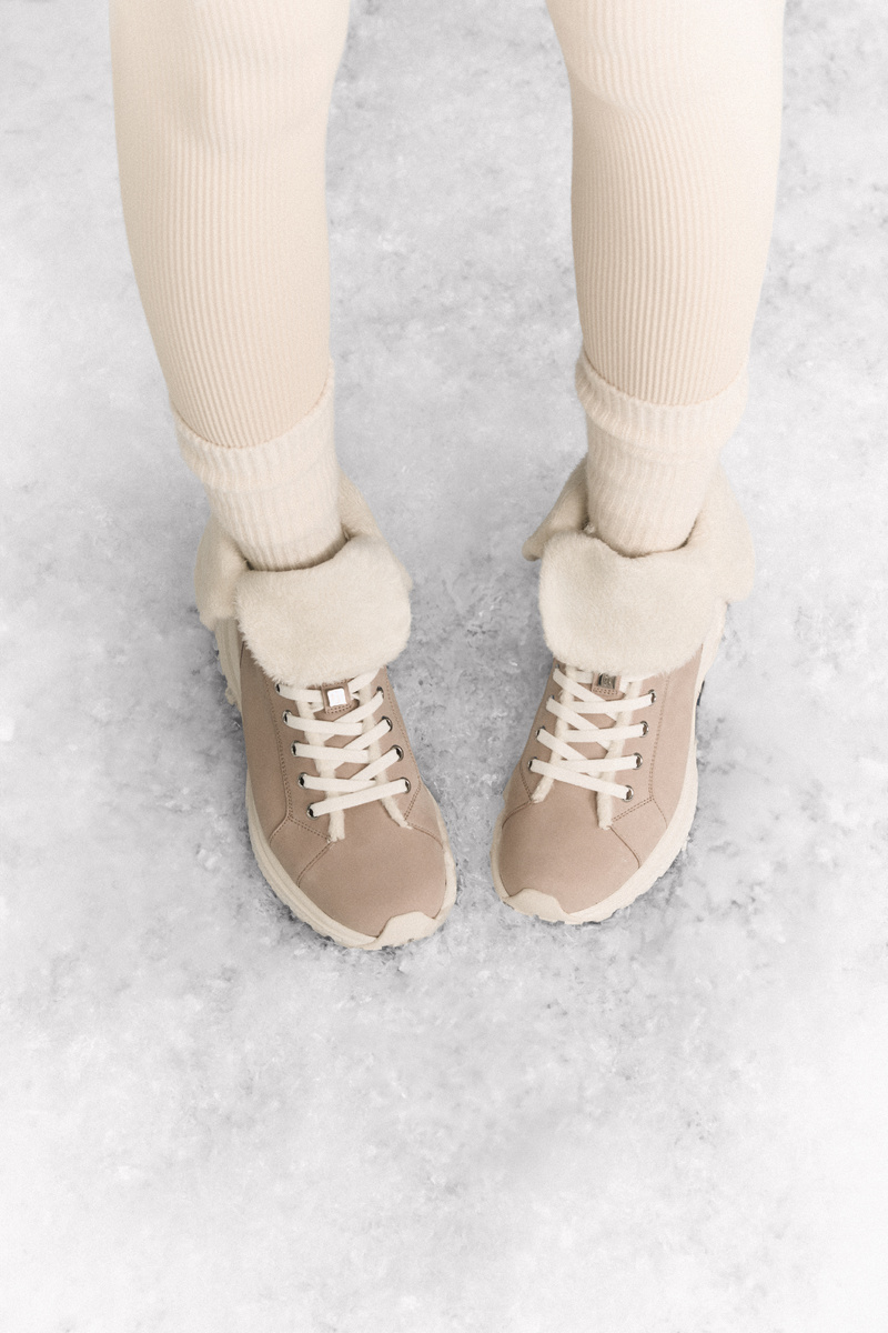 Динамичная пара для уютной зимы: в ботинках COSY спортивный силуэт гармонично сочетается с обволакивающей мягкостью. Бежевые кроссовки на шнуровке изготовлены из текстурированной кожи с бескомпромиссным вниманием к деталям. Контрастные акценты белого цвета подчёркивают утончённость модели. Подошва Vibram® заботится о комфорте благодаря чередованию фаз расслабления и активности при естественном ритме движения. Для вечера на рождественском базаре, прогулки по осеннему городу или повседневности в офисе – съёмные стельки усиливают степень комфорта, в то время как мягкая подкладка из овечьей шерсти согревает в морозную зимнюю погоду.