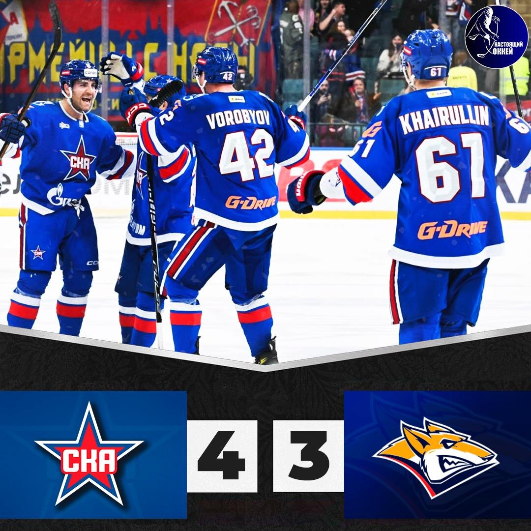 ⚡️⭐️ СКА победил лидера Востока «Металлург» и вернулся в зону плей-офф ⭐️ СКА – 🦊 Металлург Мг – 4:3 (1:0, 3:1, 0:2) ⭐️ 1:0 Дишковский (Сапего, Лутфуллин) – 02:51 (5x5) 🦊 1:1 Ткачёв (Маклюков) – 20:16 (5x5) ⭐️ 2:1 Ларионов (Бландизи, Мёрфи) – 23:43 (5x5) ⭐️ 3:1 Гримальди (Савиков, Мёрфи) – 26:40 (5x5) ⭐️ 4:1 Зеленов (Дишковский) – 34:57 (5x5) 🦊 4:2 Петунин (Пресс, Толчинский) – 41:18 (5x4) 🦊 4:3 Барак (Ткачёв, Кузнецов) – 55:35 (6x4) 🥅 Вратари: Иванов – Смолин (Набоков) 📱 Подпишись на НАСТОЯЩИЙ ХОККЕЙ