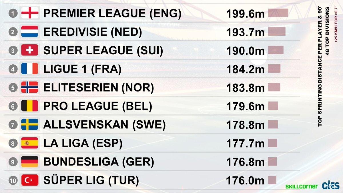 Ускорения (свыше 25 км/ч) на каждого игрока в среднем за 90 минут матча по лигам 📊