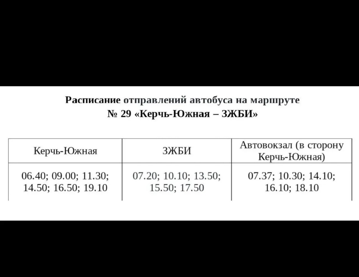 В Керчи в тестовом режиме меняют расписание автобуса №29 В Керчи с 17 ноября в ТЕСТОВОМ режиме будет изменено расписание движения автобуса на муниципальном маршруте регулярных перевозок № 29 «Керчь-Южная – ЗЖБИ»... подробнее Подписывайся на КерчьФМ.РФ @kerchfm